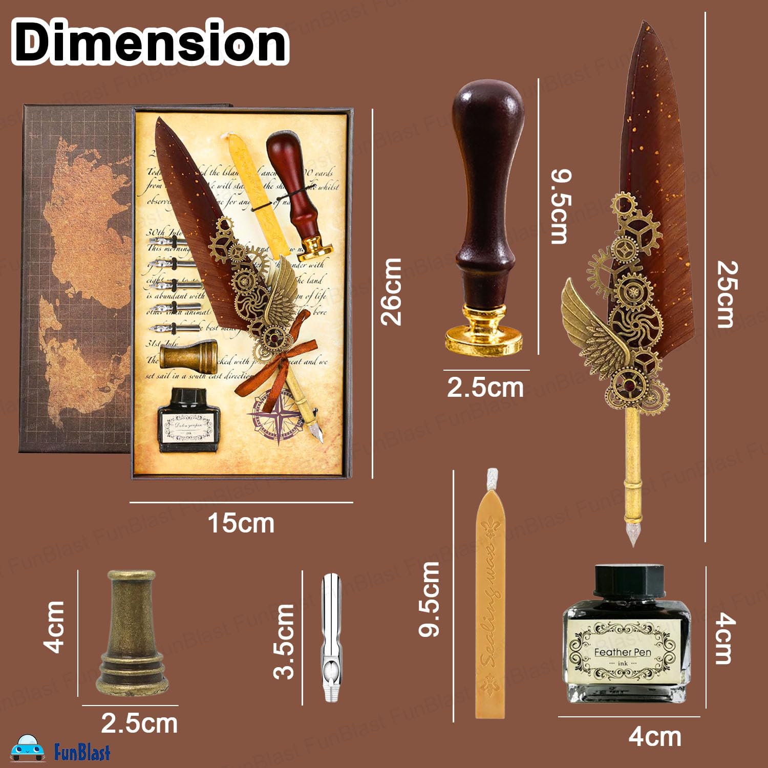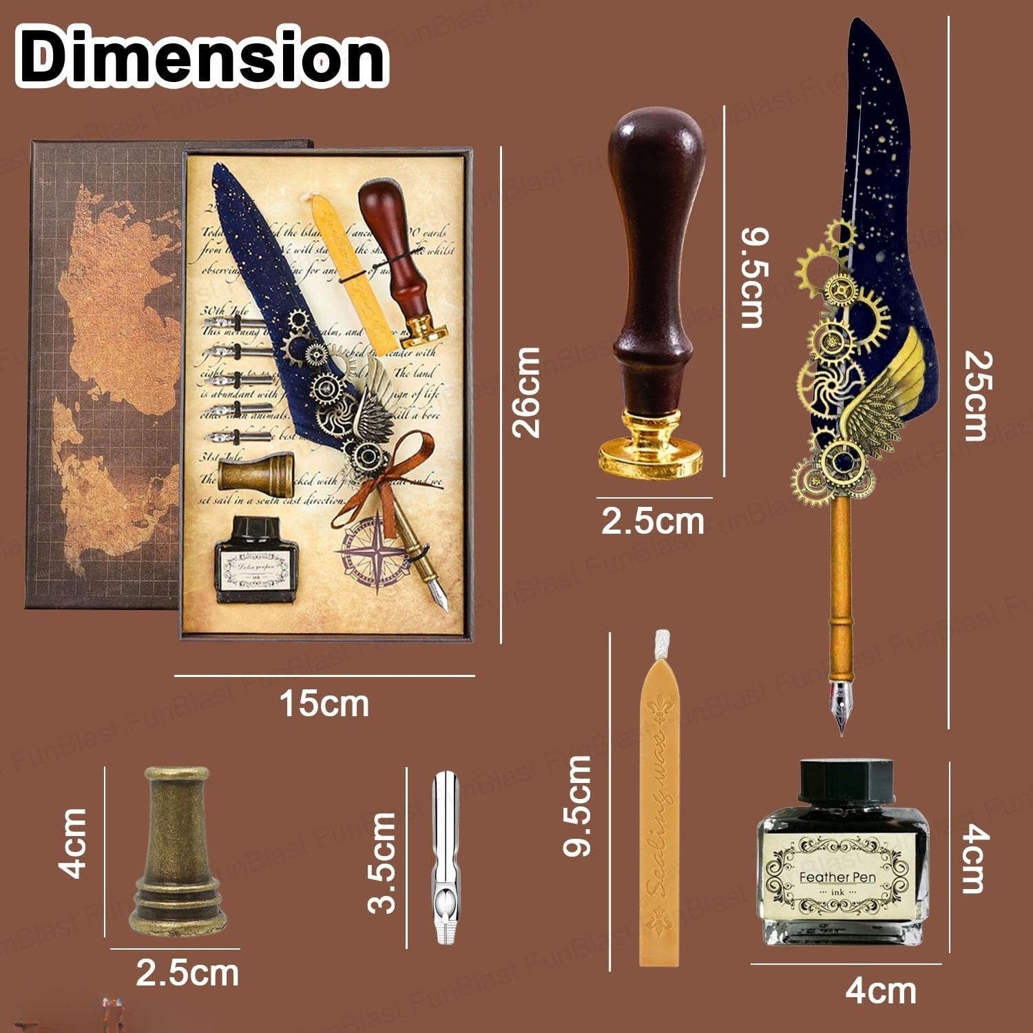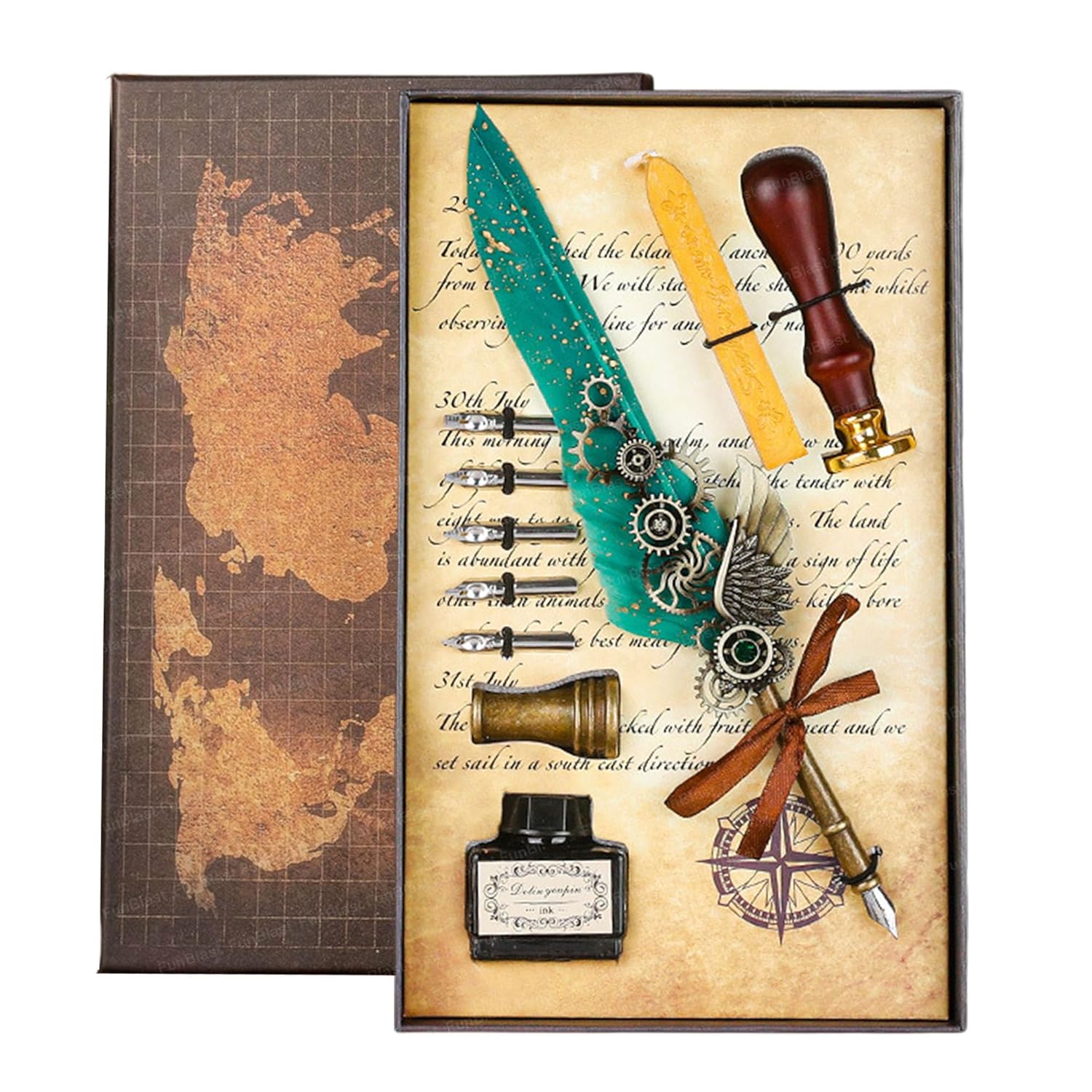 Quill Pen Ink Wax Seal Stamp Gift Set - Includes 1 feather pen, 5 replacement nibs, 1 sealant stamp handle, 1 lacquer sealant wax, 1 pen holder, 1 ink bottle